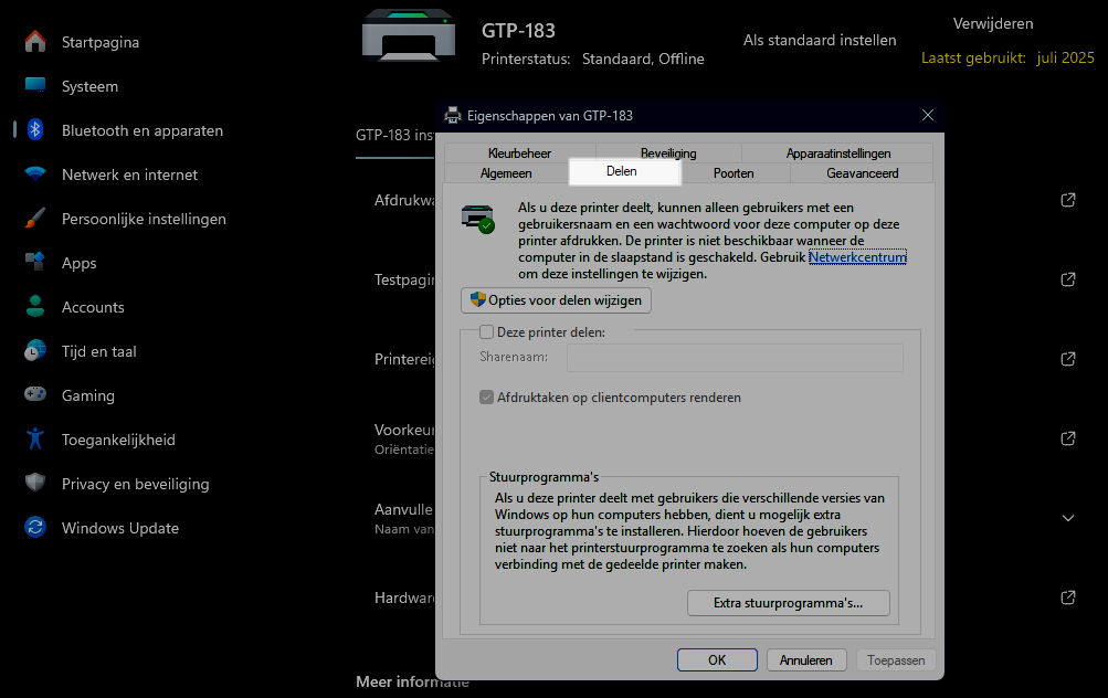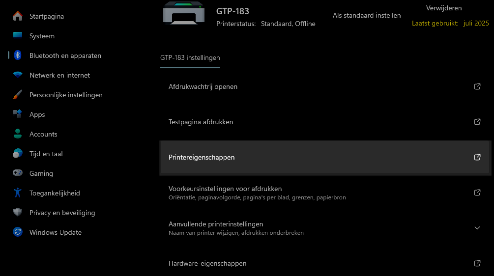 - Klik op Printereigenschappen (niet “Eigenschappen voor apparaat”)
