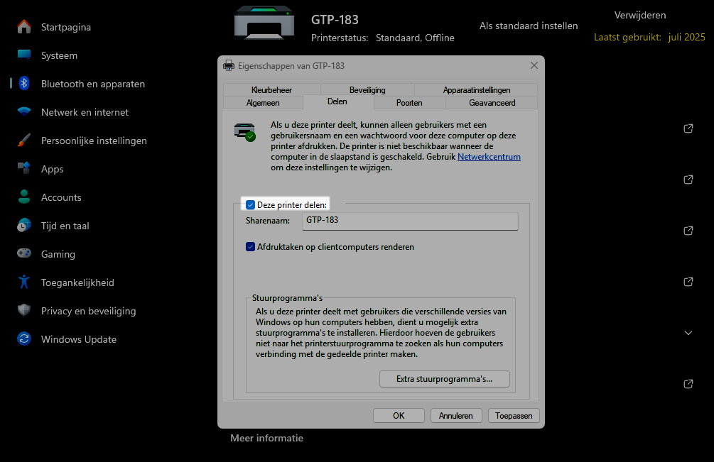 De software moet weten op welke computer de gedeelde printer zich bevindt.