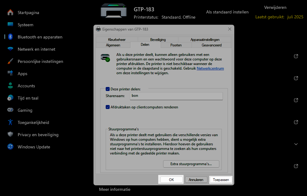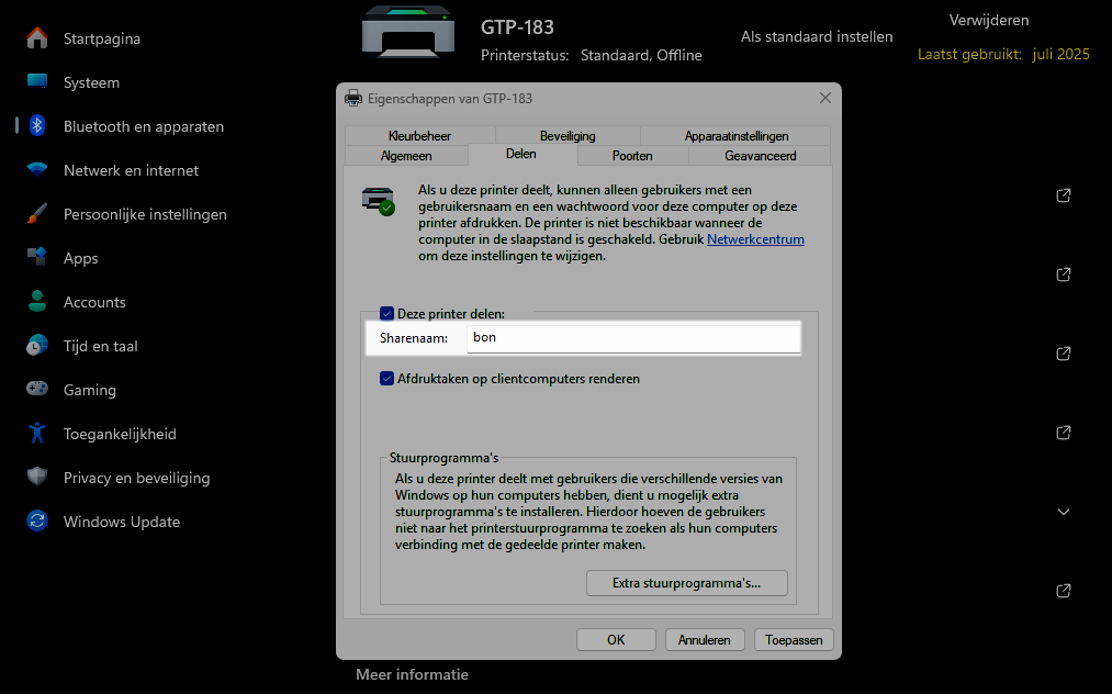 Om de kassalade via de software te kunnen aansturen, moet de bonprinter gedeeld zijn op uw computer.