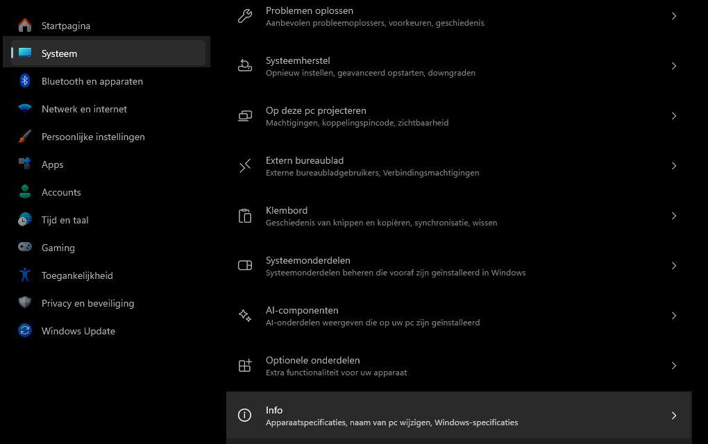 - Ga naar Systeem → Info (onderaan in de lijst)