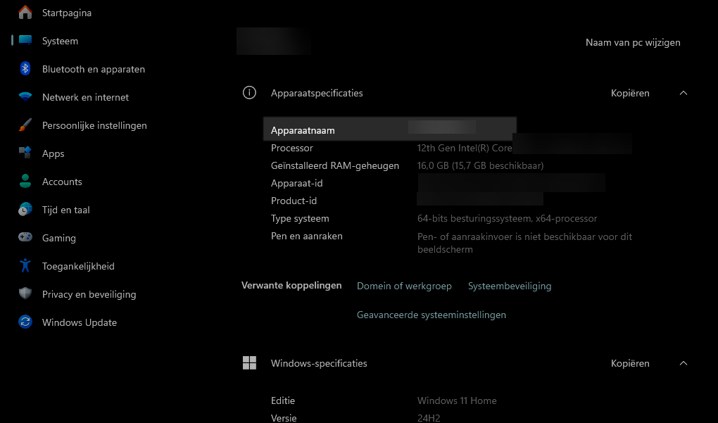 - Onder Apparaatspecificaties ziet u de Apparaatnaam — dit is de computernaam