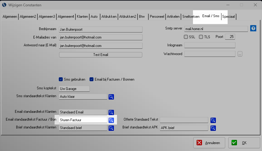 Instellingen → Constanten 1 → tabblad E-mail