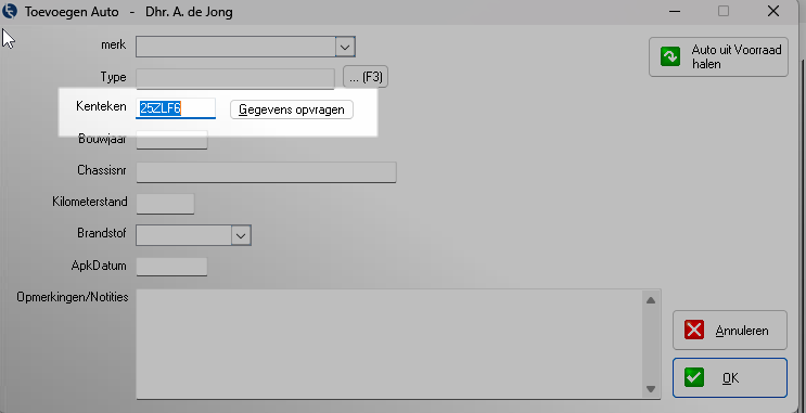 Gegevens opvragen. Beschikbare voertuiggegevens (RDW) worden automatisch ingevuld.