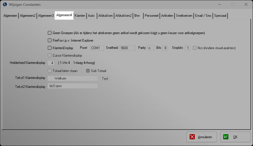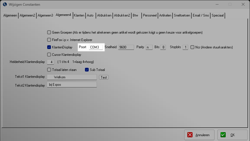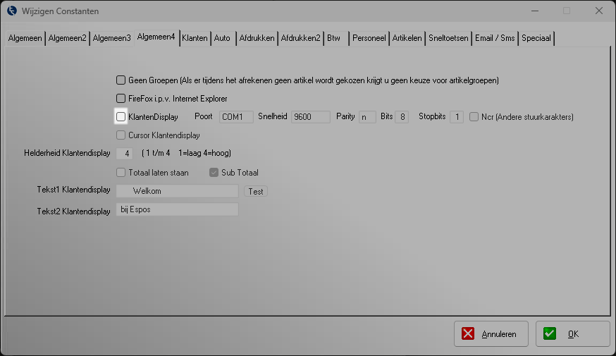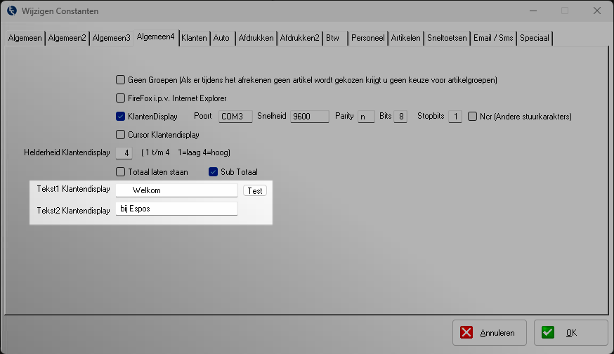 - Bij Tekst2 Klantendisplay kun je bijvoorbeeld je bedrijfsnaam invullen.