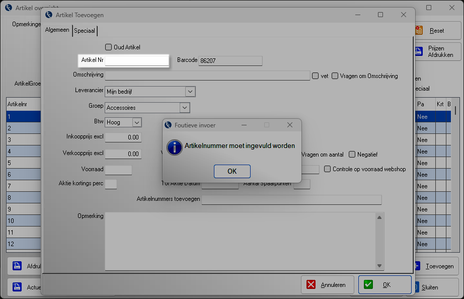 Het kan voorkomen dat bij het aanmaken van een nieuw artikel het veld artikelnummer leeg blijft. Het is echter handig als dit automatisch wordt ingevuld. (Wij adviseren om artikelnummering alleen met cijfers te doen en niet met letters.)