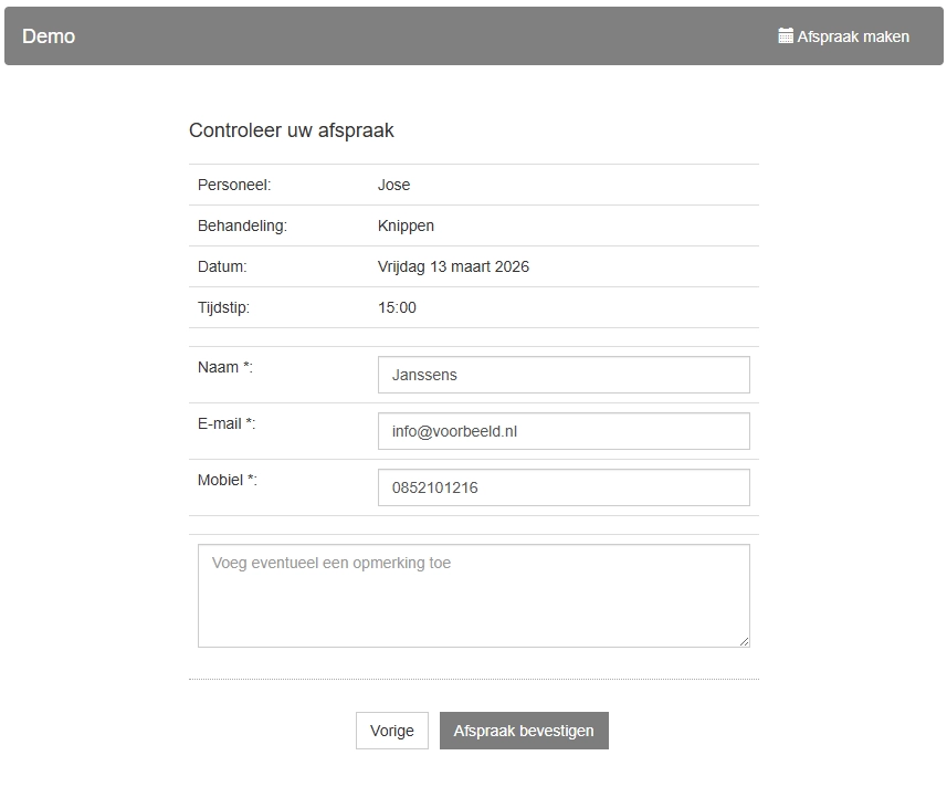 Na het invullen van deze gegevens kan de klant direct een afspraak aanvragen via de online agenda.